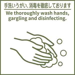 従業員は出社後に必ず体温測定を行い、体温の確認と手指の消毒を徹底しております。